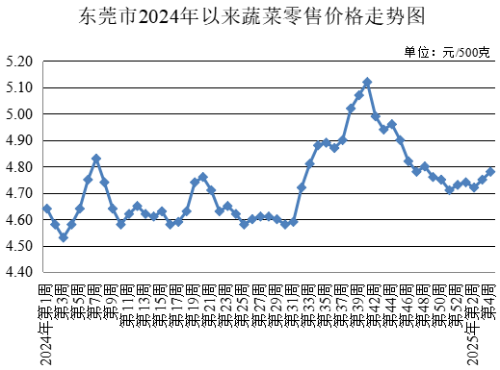 第4周,監(jiān)測的30種蔬菜農(nóng)貿(mào)市場零售均價為每500克4.78元,較上周上升0.63%。其中,葉菜類農(nóng)貿(mào)市場零售均價為每500克4.88元,較上周上升0.62%;非葉菜類農(nóng)貿(mào)市場零售均價為每500克4.69元,較上周上升0.43%。